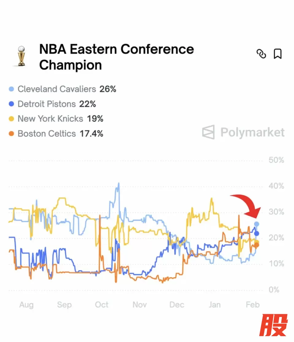 与此同时,多家美媒预测了骑士队的全新五虎:哈登、米切尔、泰森、莫布里、贾勒特-阿伦!在得到哈登之后,骑士队的夺冠赔率也得到了提升,从之前的+1200瞬间提升到+1100。而他们夺得东部冠军的概率已经提升到26%,高居东部第一位!