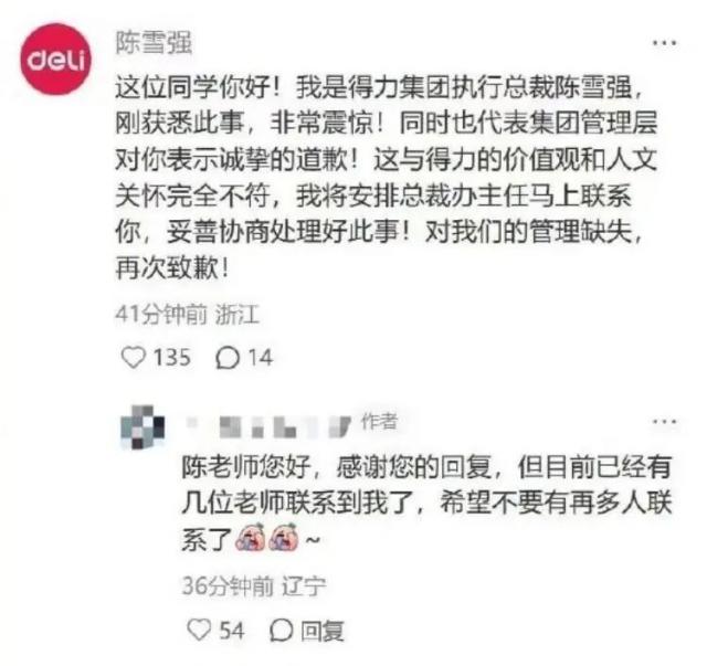 此事在社交媒体上引发广泛关注后,疑似得力集团 CEO 陈雪强账号在评论区留言致歉。该账号留言称,获悉此事后感到非常震惊,代表集团管理层向该网友表达诚挚歉意,强调这一事件与得力的价值观和人文关怀背道而驰,会安排总裁办主任马上联系网友,妥善协商处理此事。