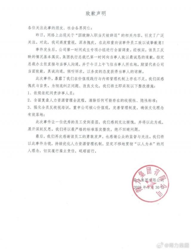 9 月 30 号下午,得力集团发布致歉声明。声明指出,事件发生后,公司第一时间成立专项小组进行全面调查。经核实,该员工反映的情况基本属实。集团执行总裁已第一时间向当事人致以最诚恳的道歉,指定总裁办主任直接与当事人沟通,并于今日上午飞往当事人所在地,期望代表公司当面致歉,真诚沟通,倾听诉求,以务实的态度获得当事人的谅解。